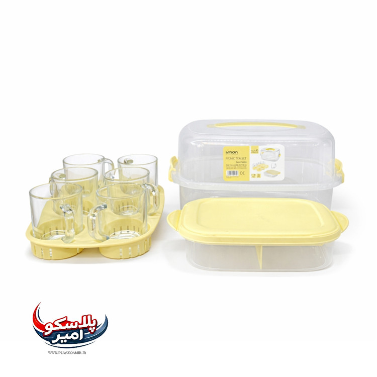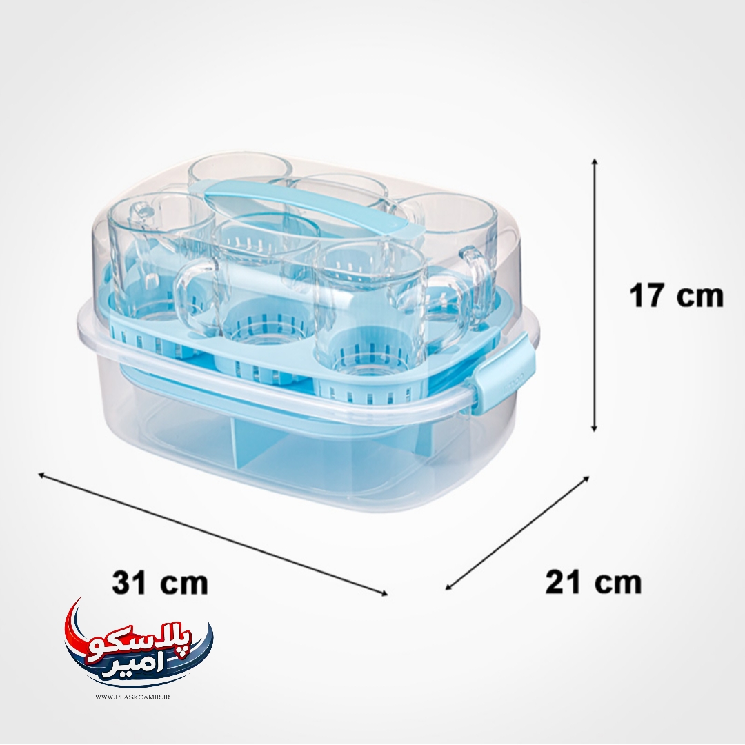 اقلام داخل بسته: 6 عدد لیوان شیشه ای دسته دار + سینی سرو + نظم دهنده 3 قسمته + باکس حمل