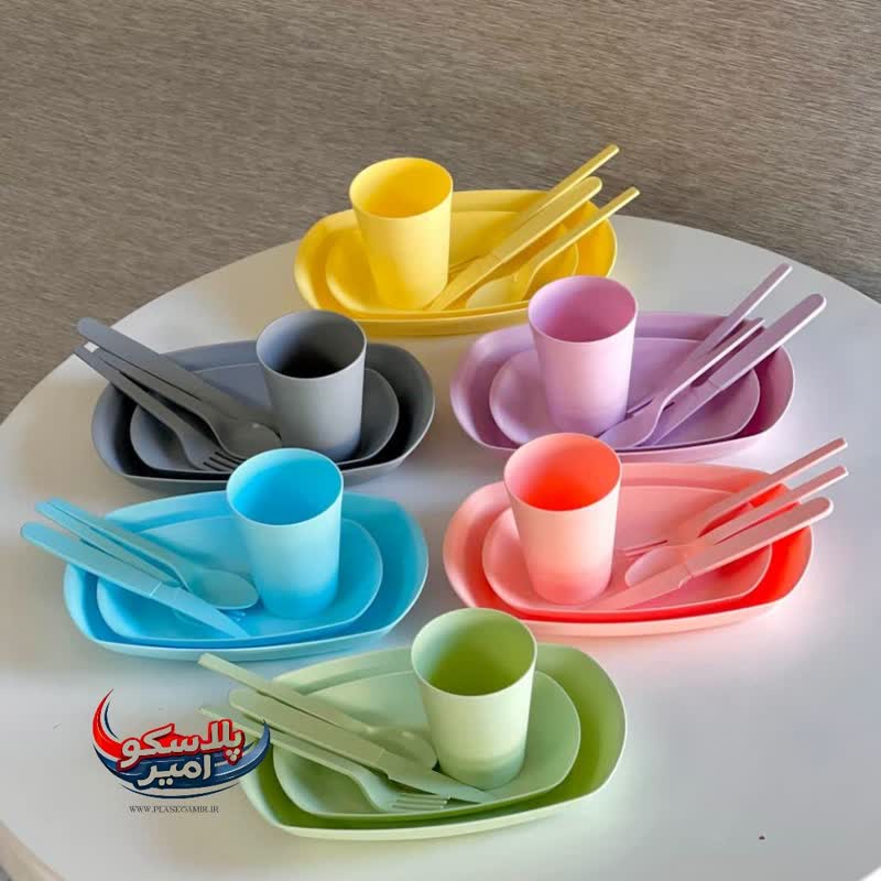 باکس نگهدارنده قاشق و چنگال 6 عدد لیوان ، 6 عدد بشقاب کوچک، 6 عدد بشقاب بزرگ، 6 عدد قاشق، 6 عدد چنگال، 6 عدد کارد یک سینی مستطیلی با ابعاد 26*18 سانتی متر یک عدد آبکش یک عدد نمکپاش و فلفل پاش